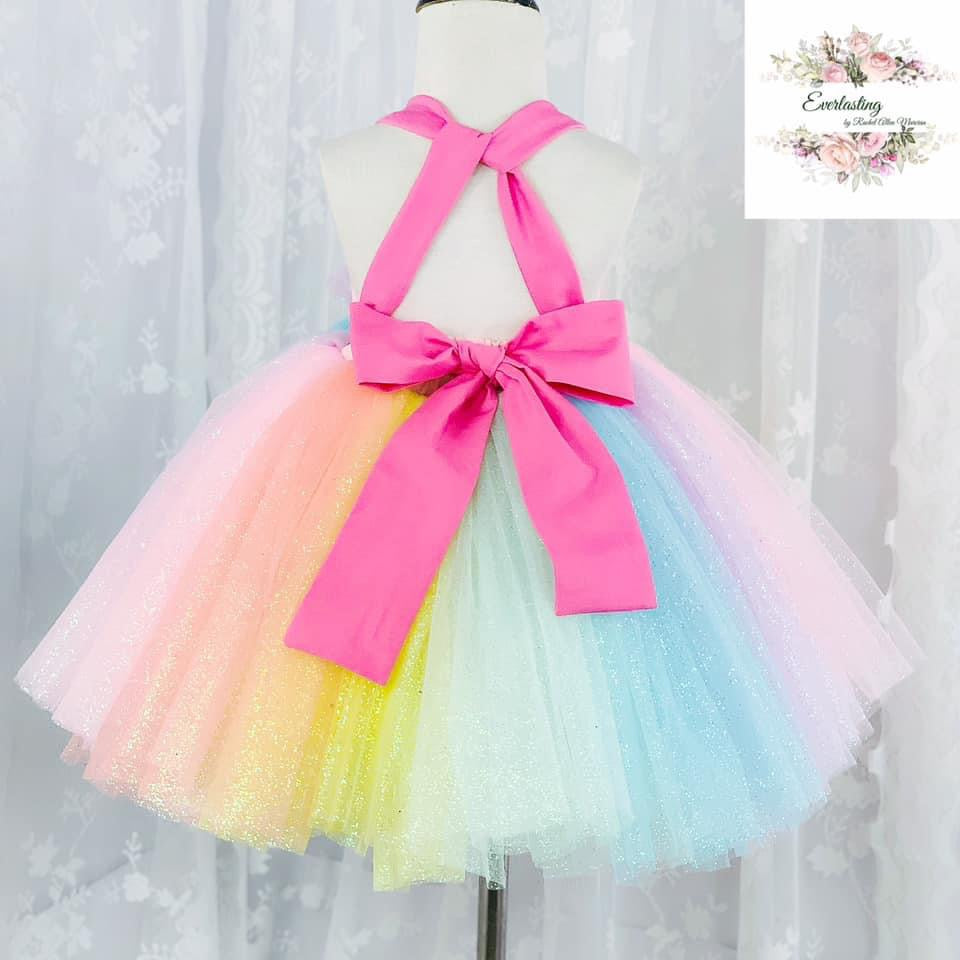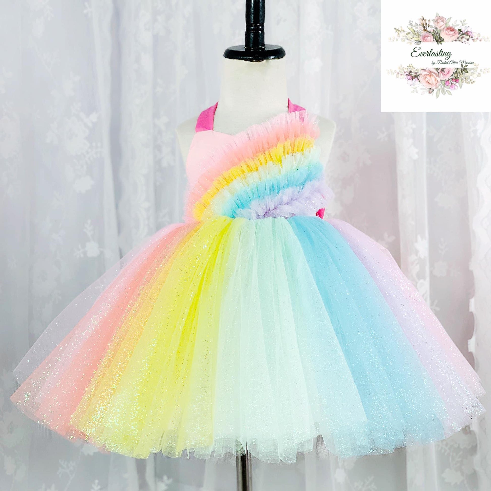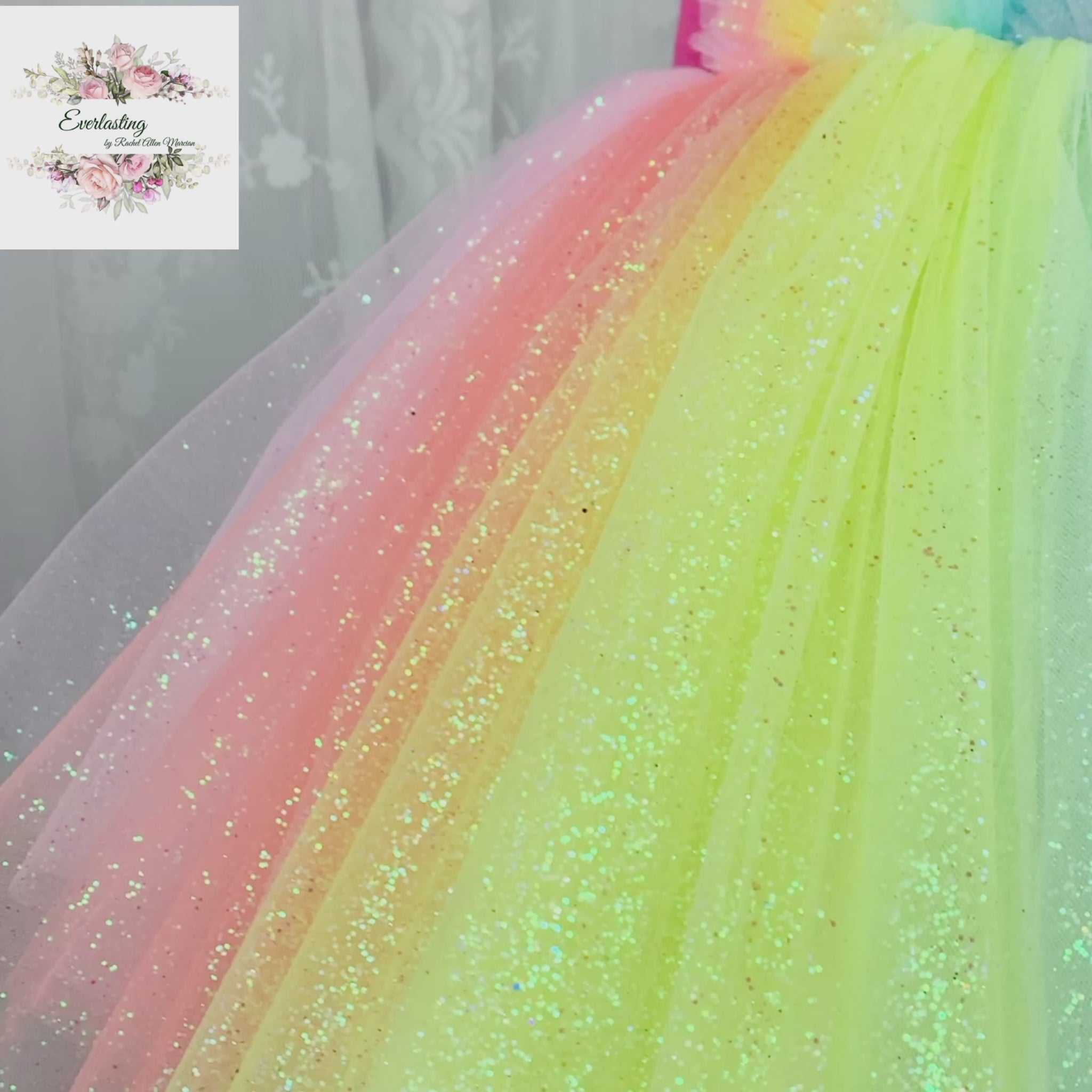 Imena is a pastel rainbow dress in candy colored glitter tulles! The bodice features a ruffled rainbow, adjustable shoulder straps that can be tied multiple ways, and an elasticized back waist for flexibility and comfort. The voluminous skirt has the full rainbow spectrum on front and back. Fully lined in comfy cotton. More photos in comments.